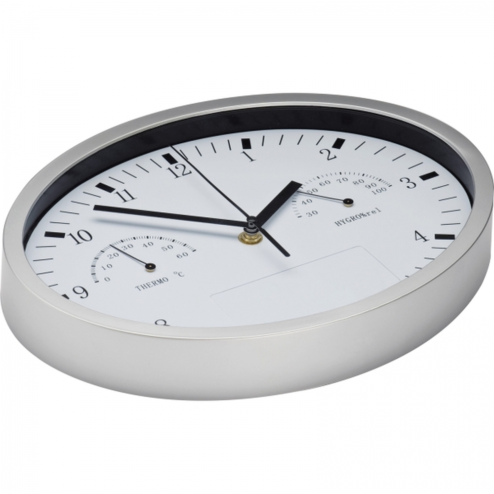 Owalny zegar ścienny z termometrem i higrometrem. Logotyp można umieścić na specjalnym panelu.