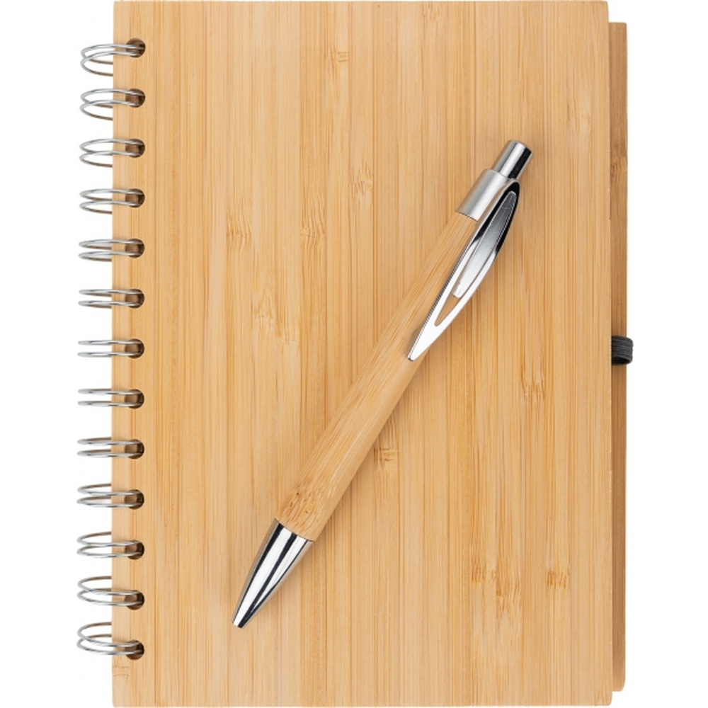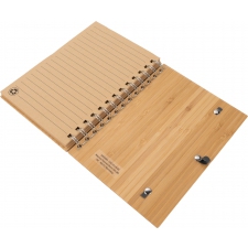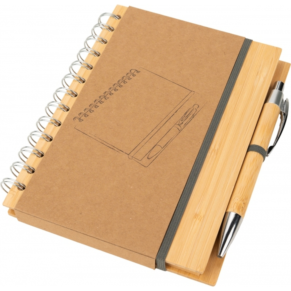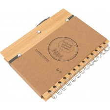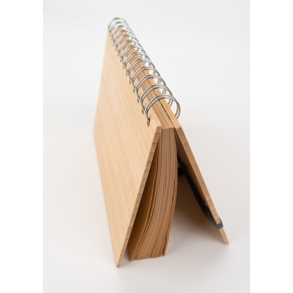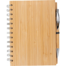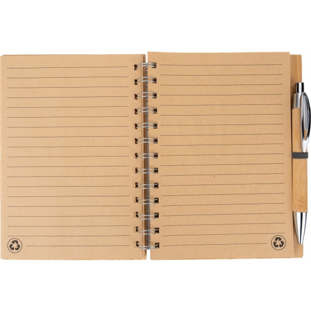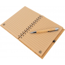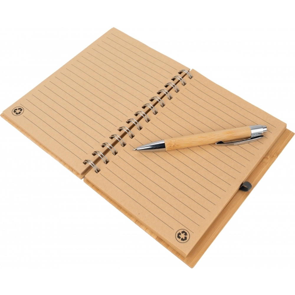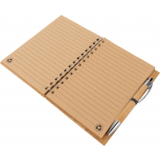 Notes A5 w okładce z bambusa. Zawiera 140 stron z niebielonego papieru w linie pochodzącego z recyklingu, a także bambusowy długopis z niebieskim wkładem.