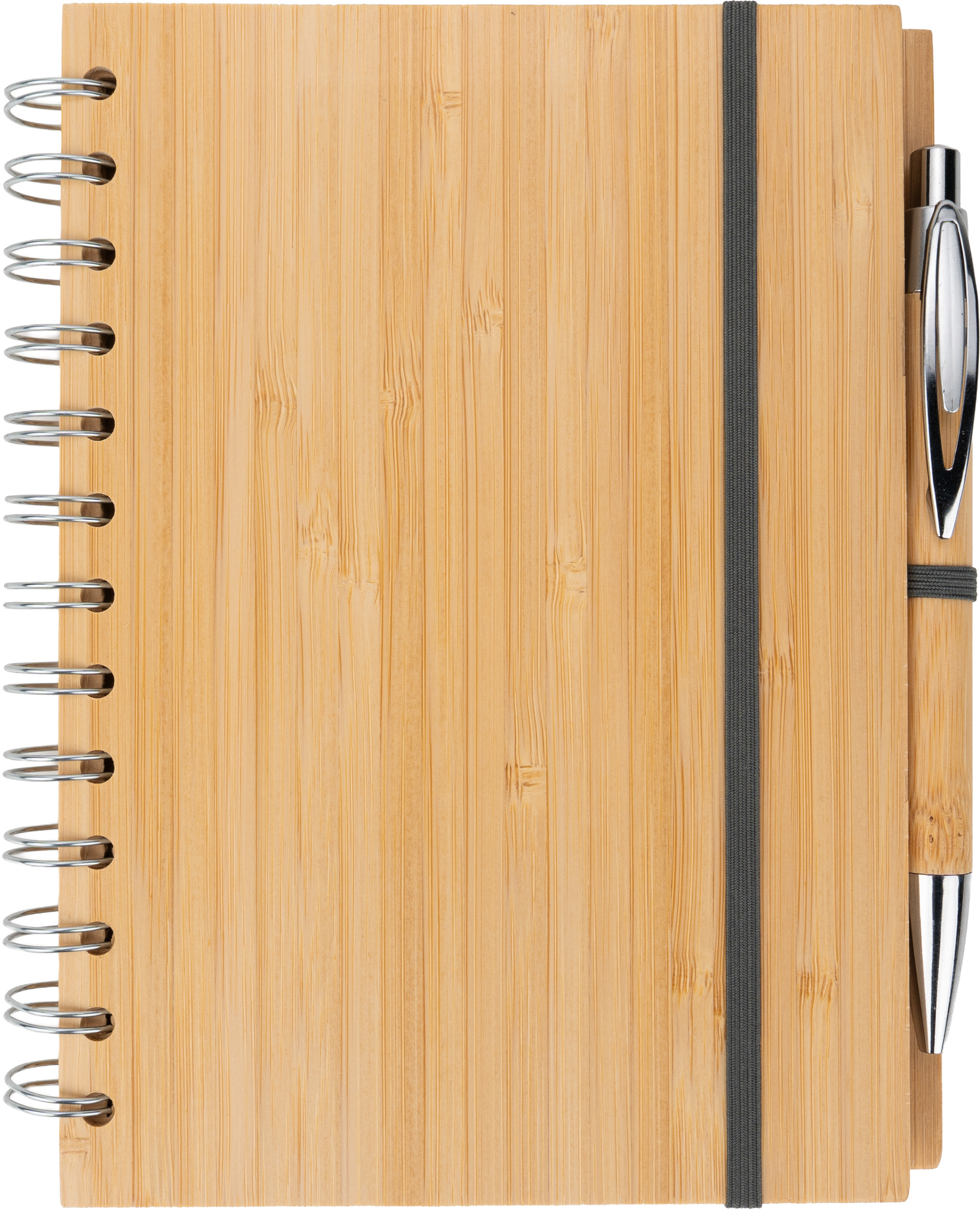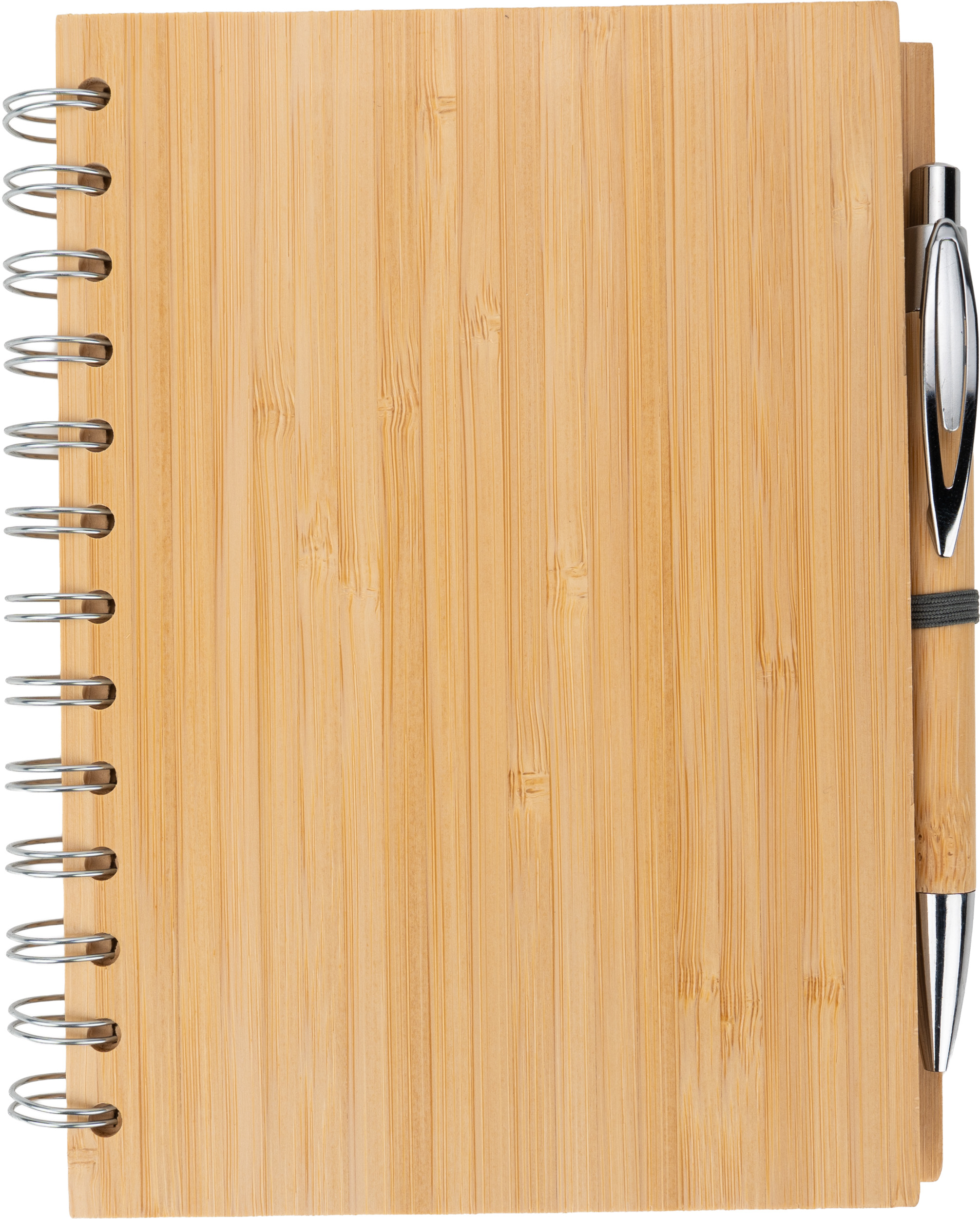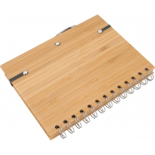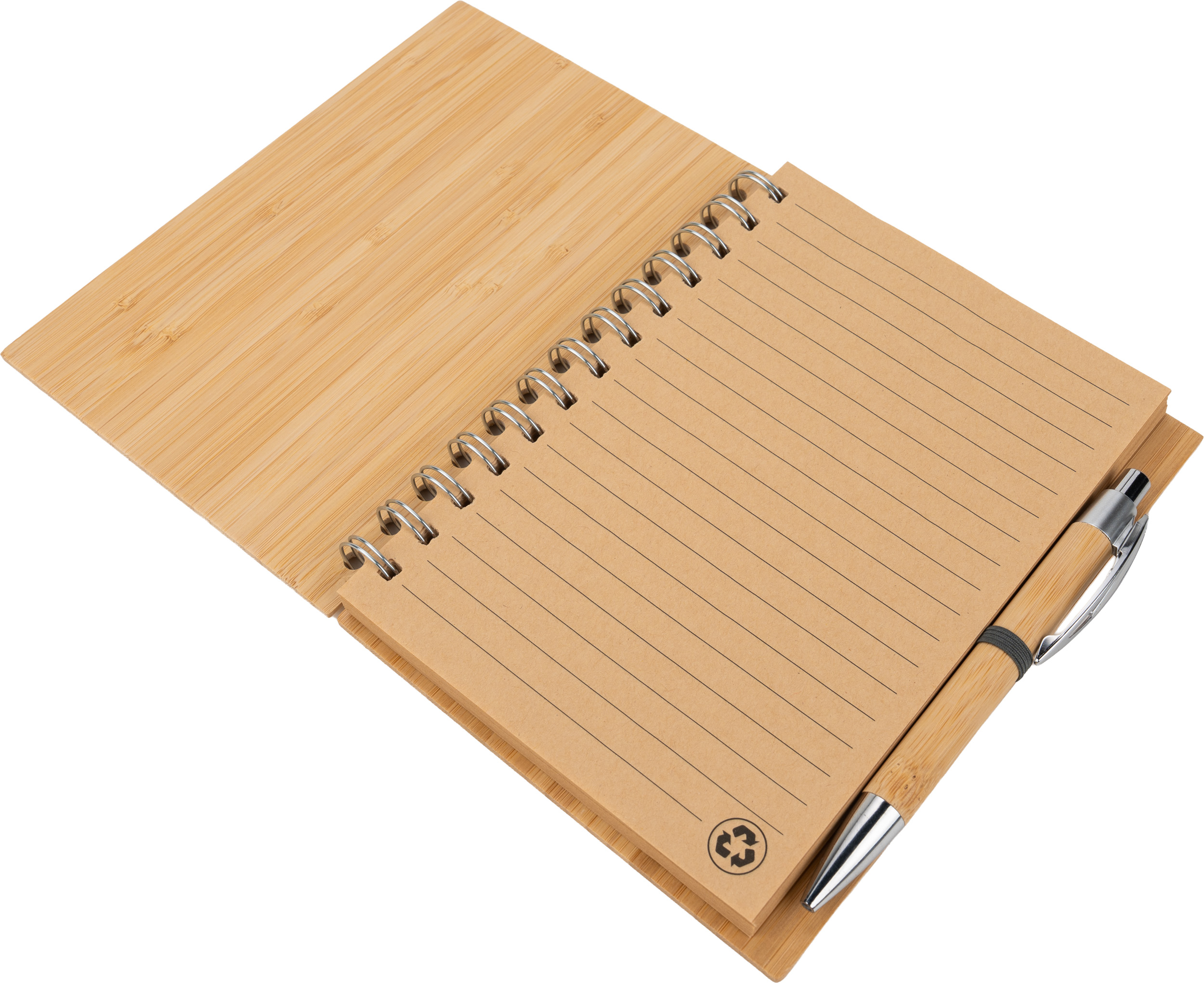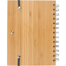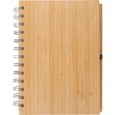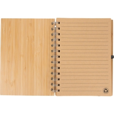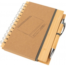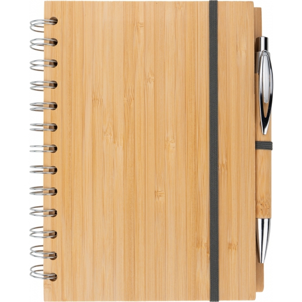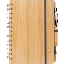 Notes A5 w okładce z bambusa. Zawiera 140 stron z niebielonego papieru w linie pochodzącego z recyklingu, a także bambusowy długopis z niebieskim wkładem.