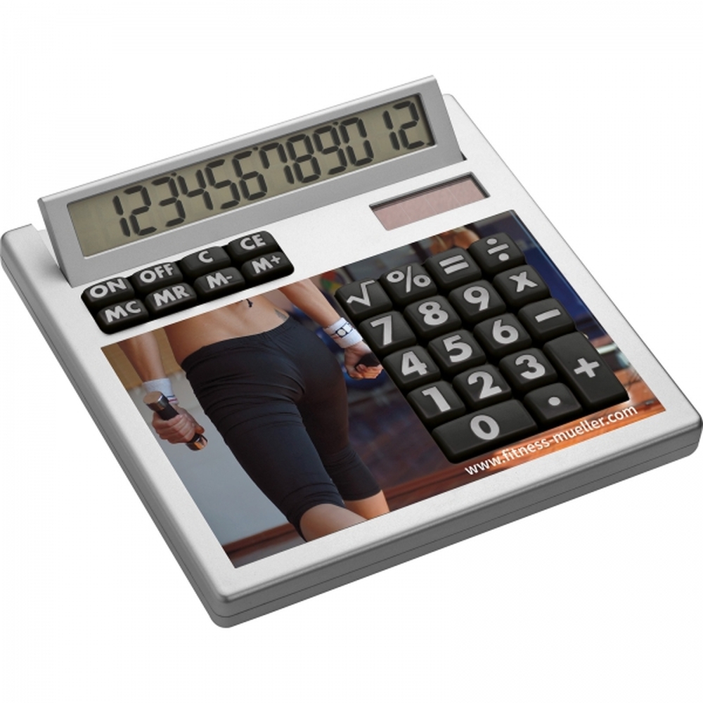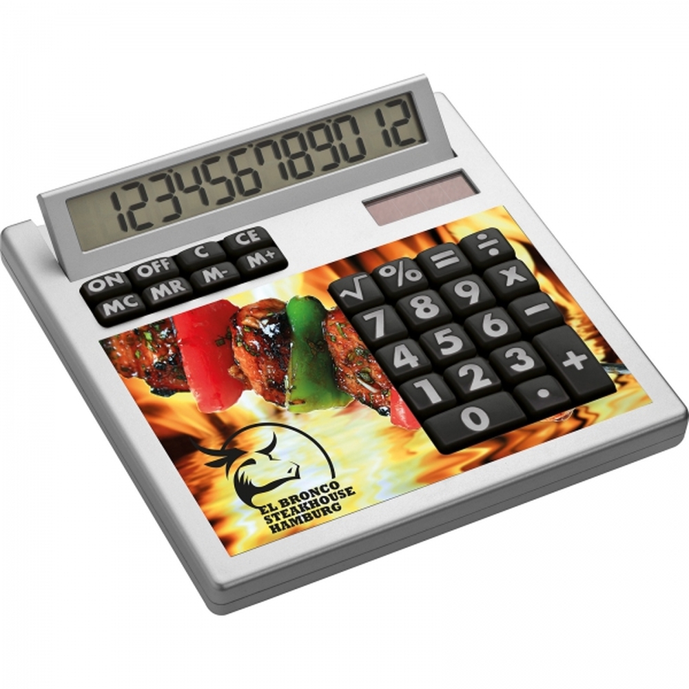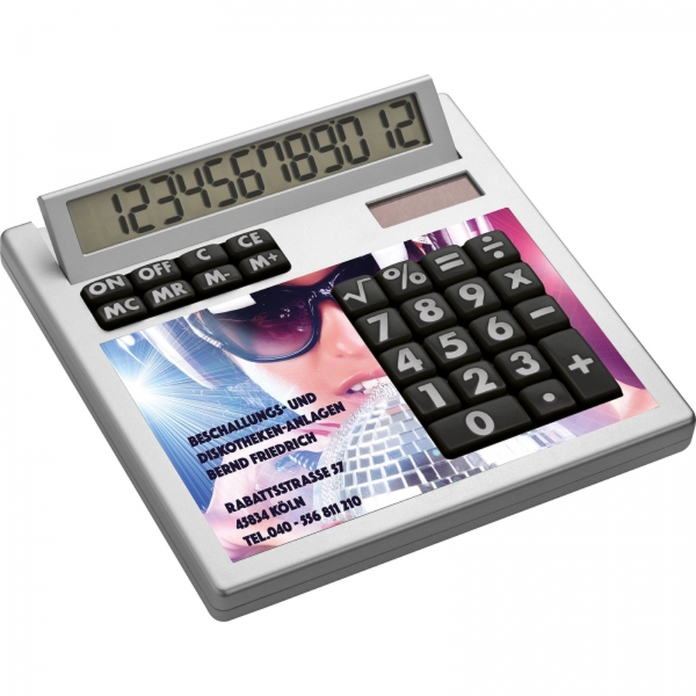 Niepowtarzalny kalkulator z kolekcji CrisMa z 12 cyfrowym wyświetlaczem, wykonany z plastiku w kolorze srebrnym. Posiada nietypową nakładkę w kolorze białym, która może zostać w całości nadrukowana. Zasilanie solarne i na baterię.
