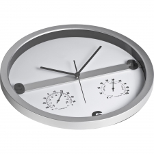 Minimalistyczny, designerski zegar. Wytrzymała obudowa. Dużo miejsca na nadruk na samej tarczy. Cichy mechanizm. Dodatkowy wskażnik temperatury i wilgotności powietrza. Brak baterii w zestawie.