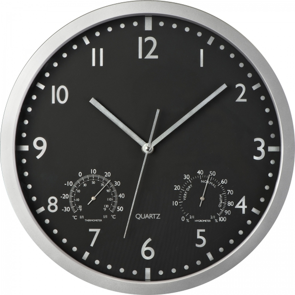 Elegancki zegar w wytrzymałej obudowie. Kontrastująca tarcza i duże cyfry. Dodatkowy wskaźnik temperatury i wilgotności powietrza. Brak baterii w zestawie.