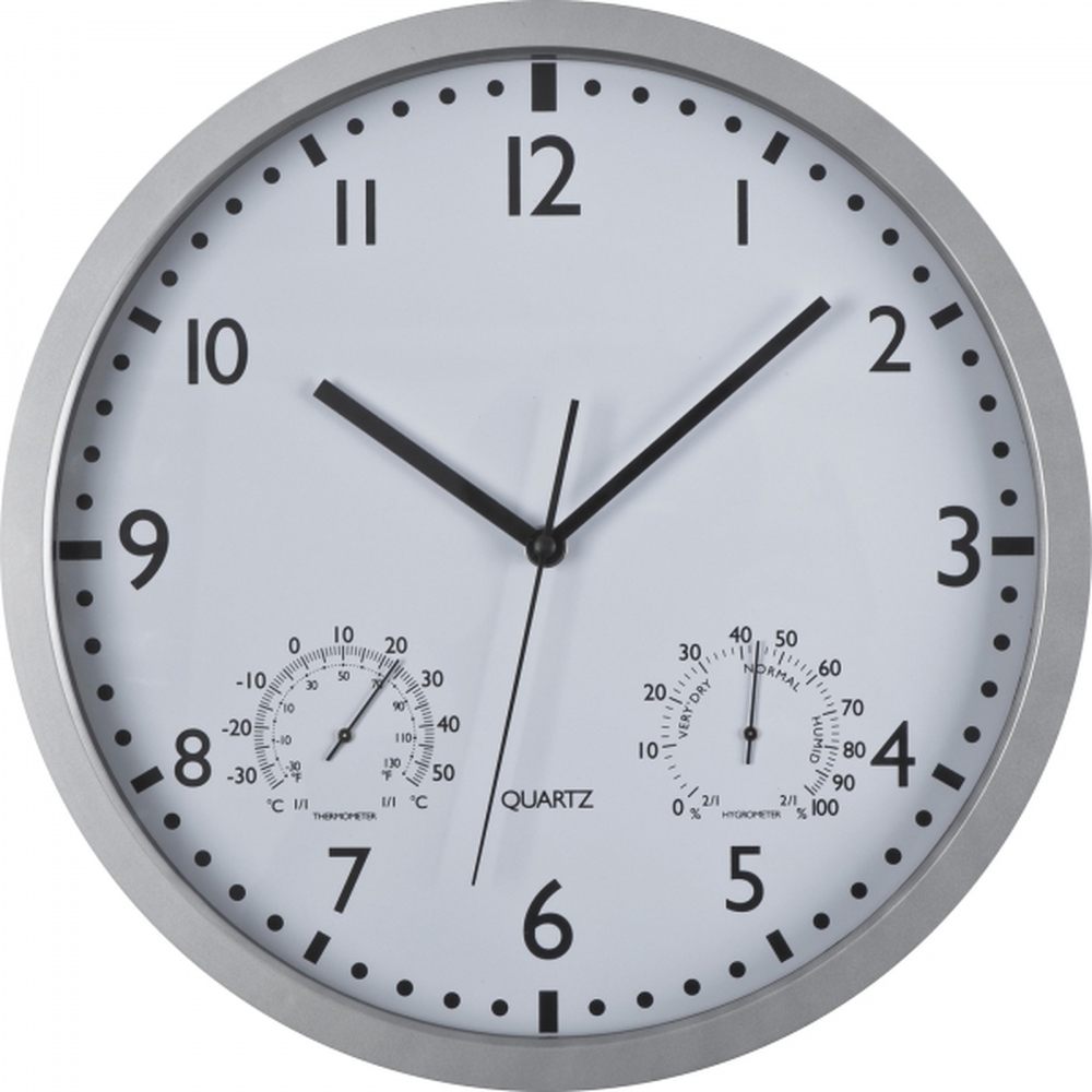 Elegancki zegar w wytrzymałej obudowie. Kontrastująca tarcza i duże cyfry. Dodatkowy wskaźnik temperatury i wilgotności powietrza. Brak baterii w zestawie.