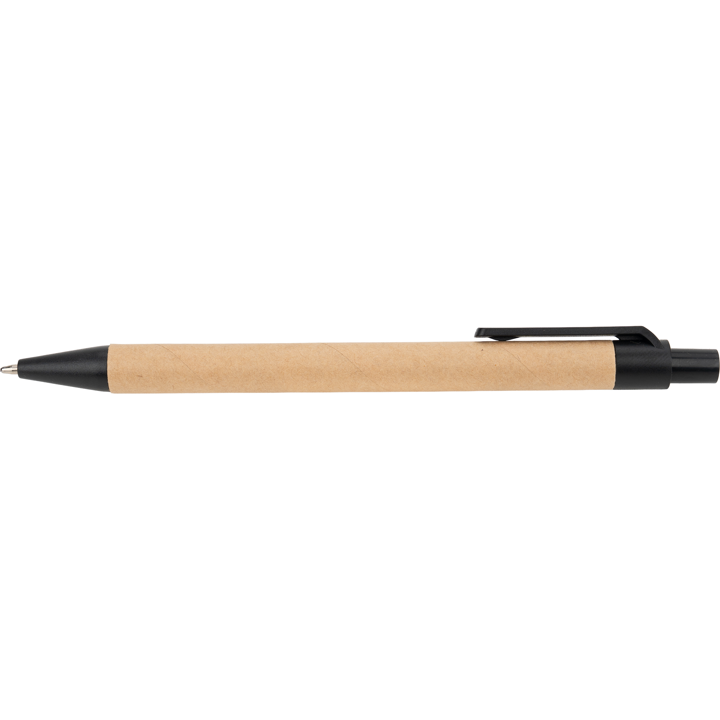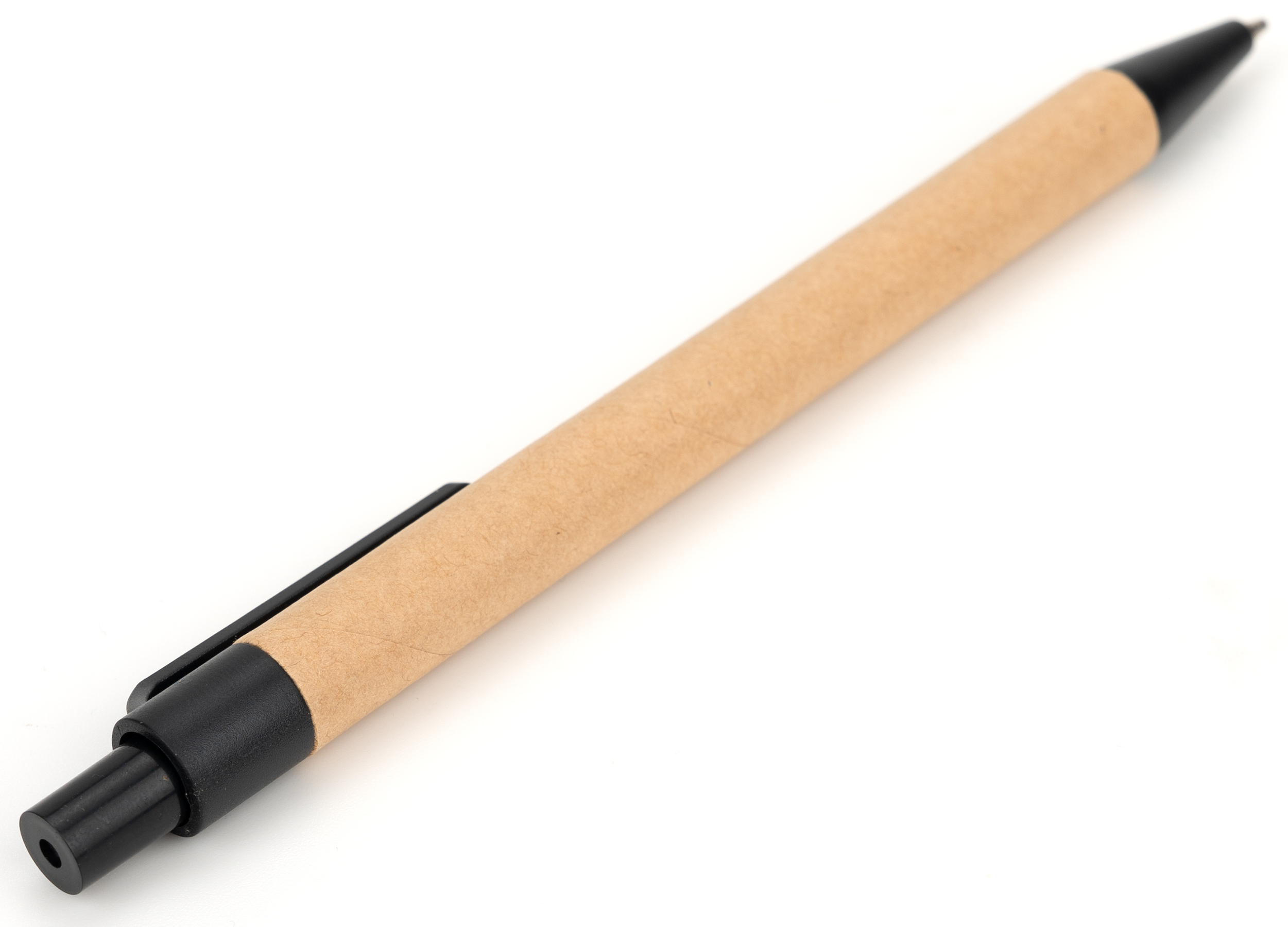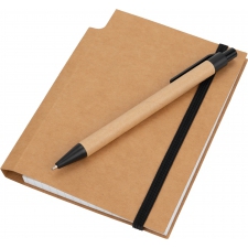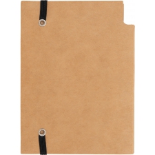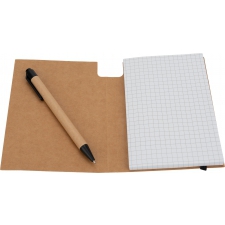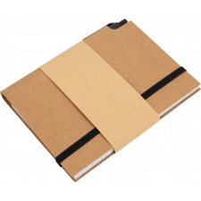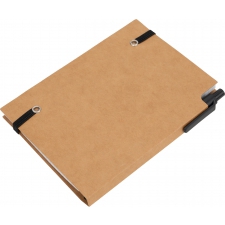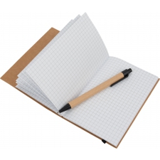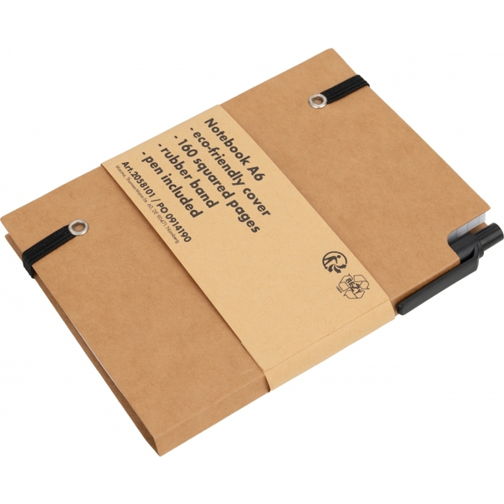 Mały notes (160 stron w kratkę) z ekologiczną okładką z kartonu i gumką do zamykania. W zestawie z długopisem.