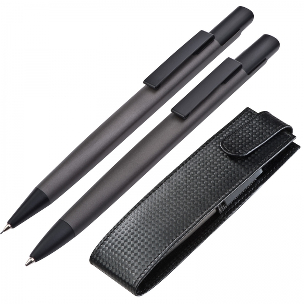 Metalowy zestaw piśmienniczy składający się z długopisu piszącego na niebiesko oraz ołówka automatycznego. Artykuły piśmienne umieszczone w etui zapinanym na zatrzask.