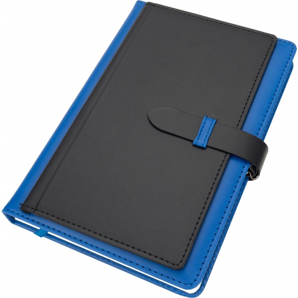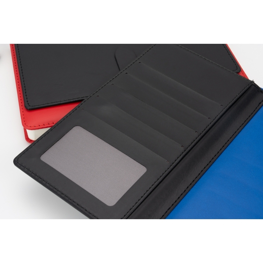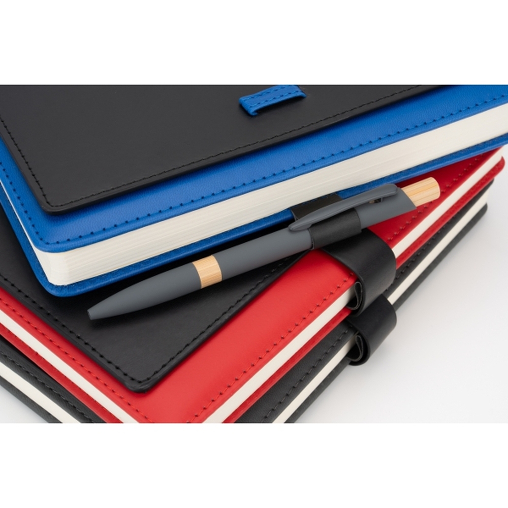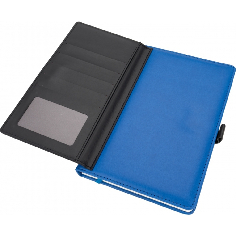 Notatnik A5 w okładce z PU, ze 128 kartkami w linie, miejscem na długopis i wizytownikiem na 5 wizytówek.