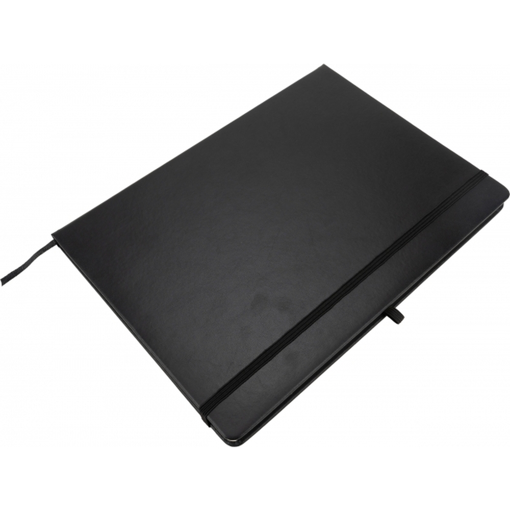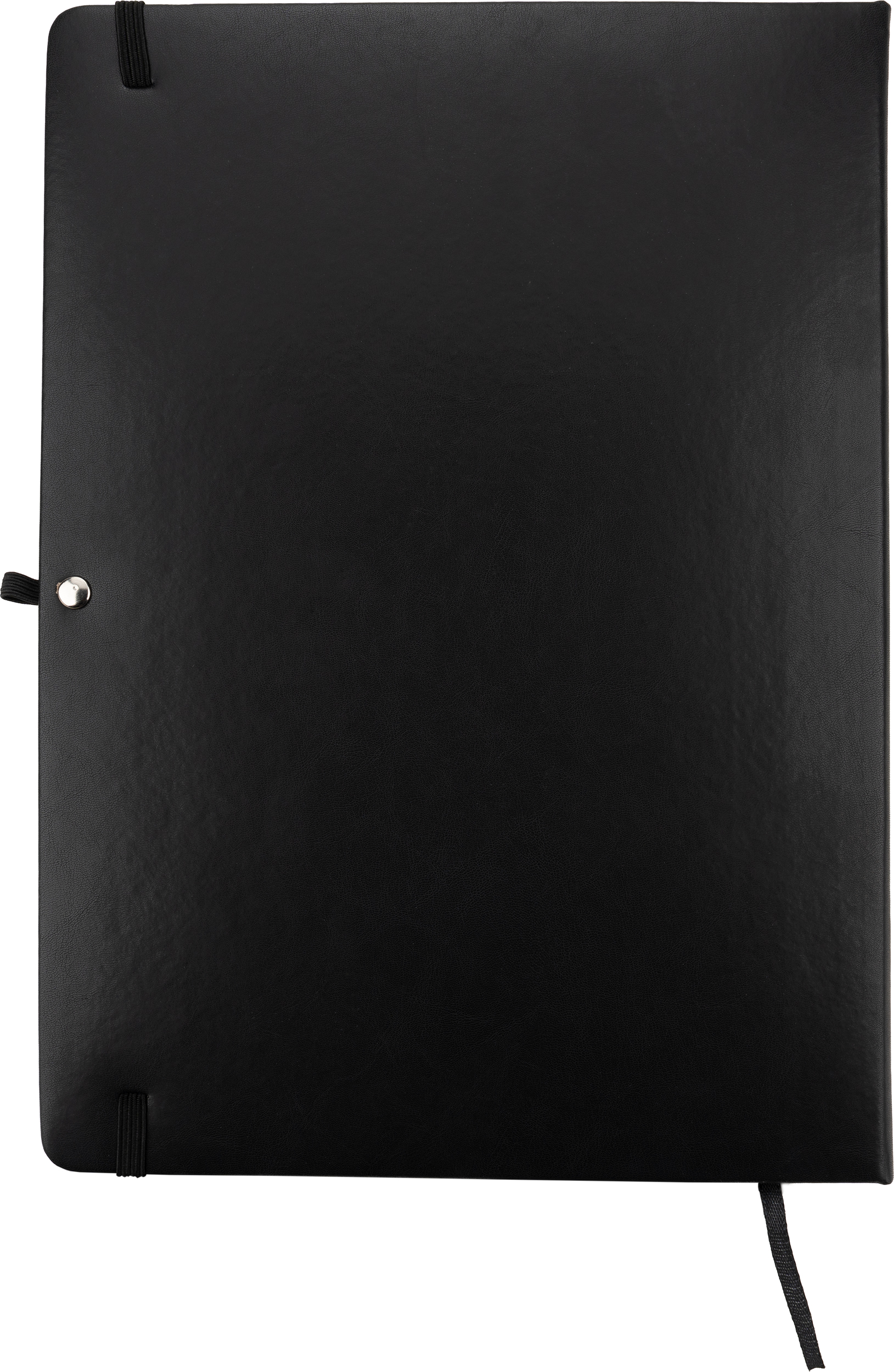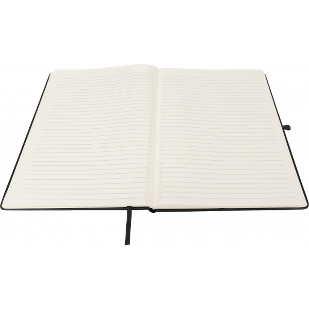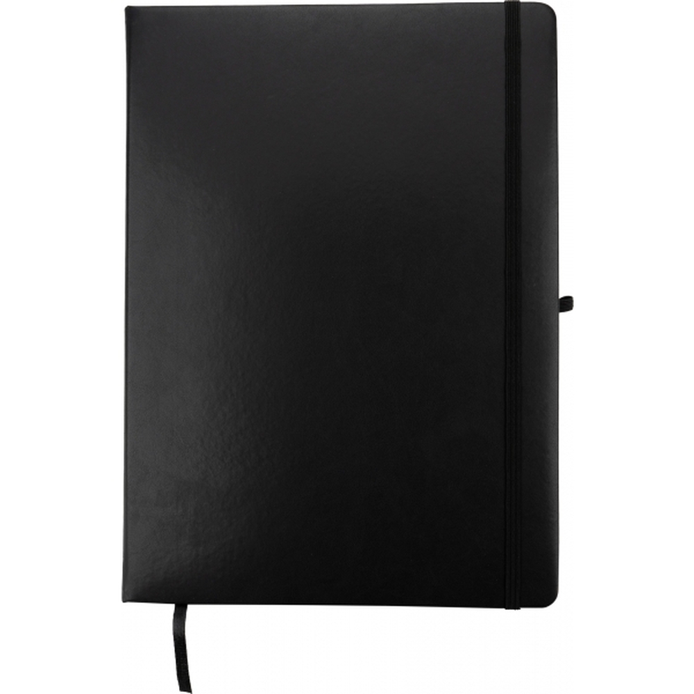Notes A4 w linie (80 kartek) z okładką z tworzywa sztucznego, zakładką i miejscem na długopis. Zamykany na gumkę.