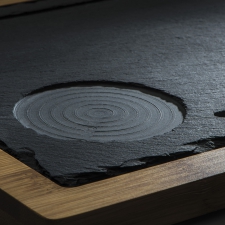 Dodatkowo, taca została wyposażona w praktyczne zagłębienie, które skutecznie zatrzymuje napój w przypadku rozlania, chroniąc powierzchnie przed plamami i zanieczyszczeniami. Płyta łupkowa na tacy dodaje eleganckiego akcentu, jest bezpieczna w kontakcie z żywnością i stanowi idealne tło dla serwowanych przekąsek. Jej dodatkowym atutem jest również to, że schłodzona taca łupkowa posiada doskonałe właściwości termoizolacyjne.