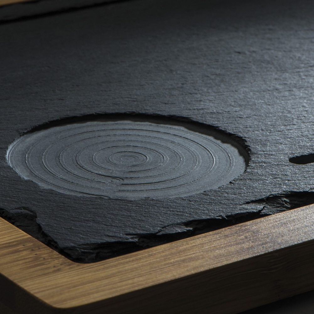 Bambusowa deska z płytą łupkową. Na tacy znajduje się miejsce na kubek oraz zagłębienie, które zatrzyma napój w przypadku rozlania.