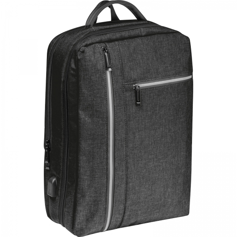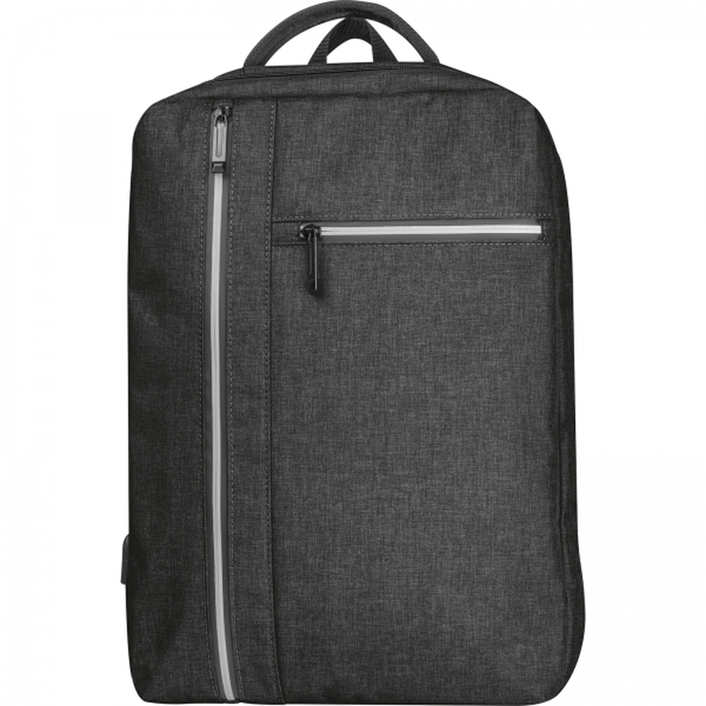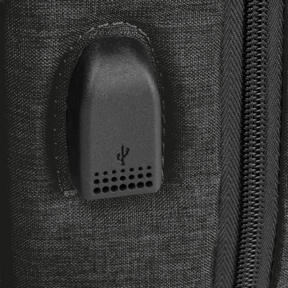 Wodoodporny plecak wykonany z nylonu, z watowanymi szelkami, przegrodą na laptopa 15,6", wyjściem na kabel USB i dwiema przednimi kieszeniami.