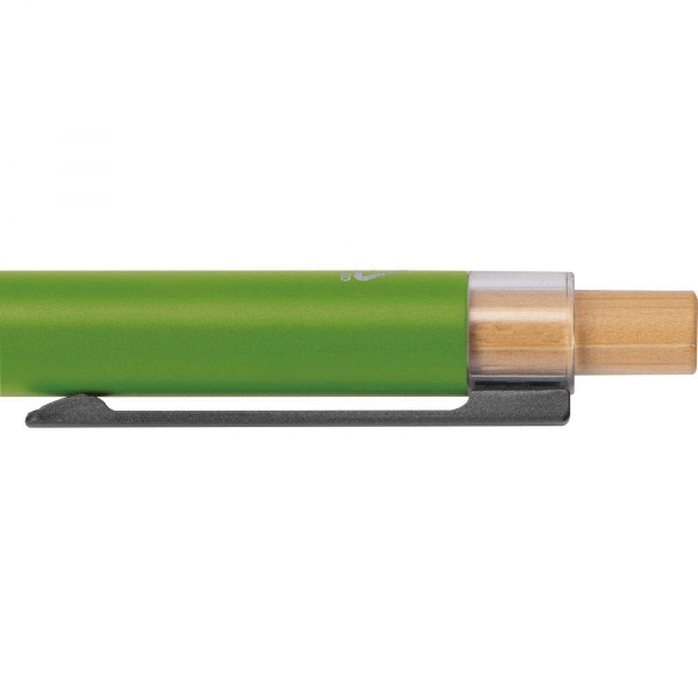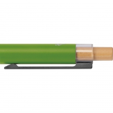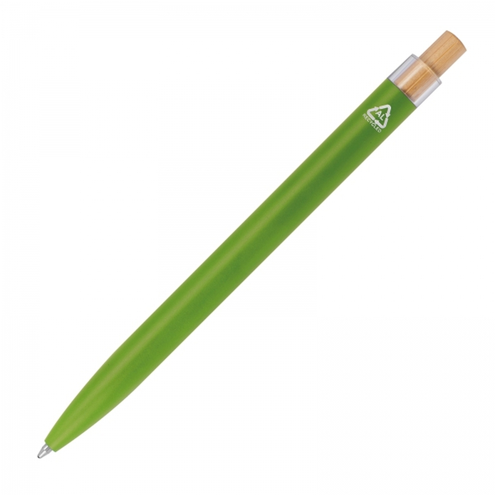 Długopis wykonany z aluminium pochodzącego z recyklingu, z niebieskim wkładem i bambusowym przyciskiem. Długopis wykonano z solidnego materiału, a dzięki odpowiedniemu ciężarowi, jest wyjątkowo wytrzymały i dobrze wyważony w dłoni. Powłoka długopisu gładka w dotyku, matowa.