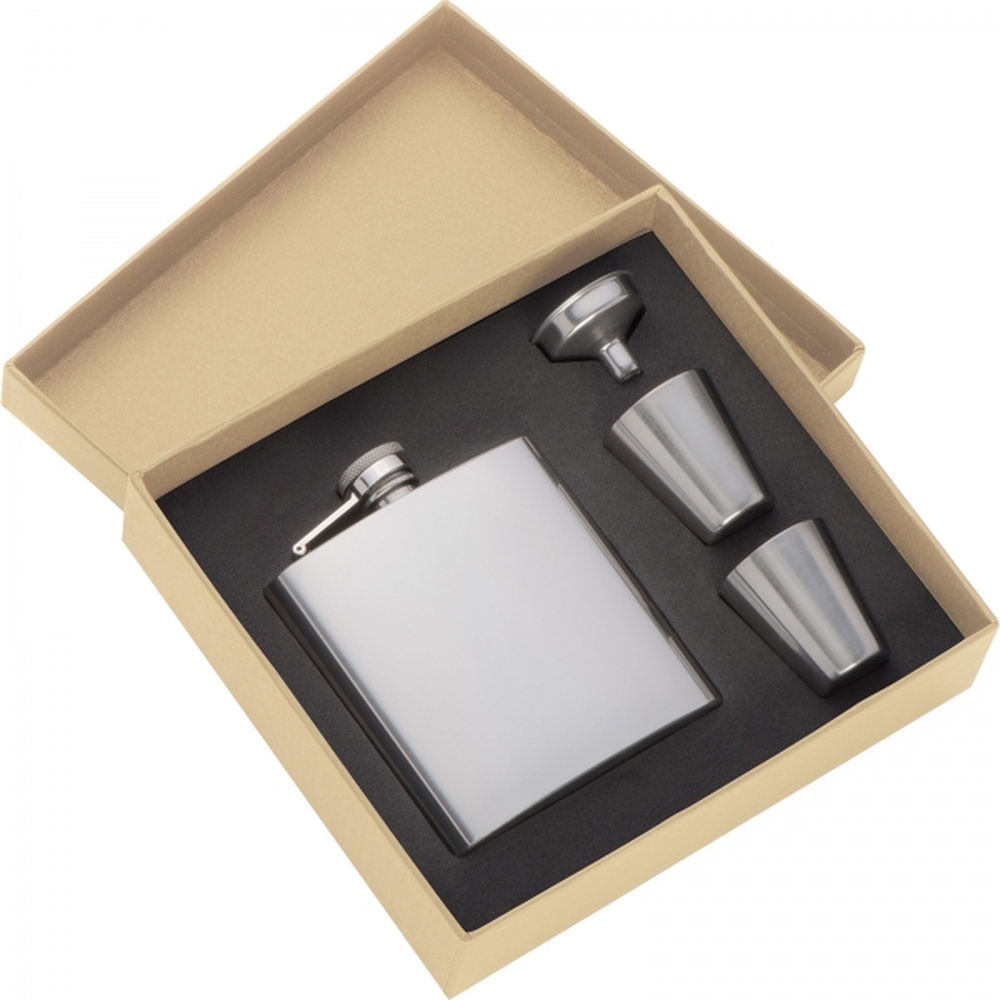 Klasyczna piersiówka wykonana ze stali nierdzewnej w zestawie z dwoma kieliszkami i lejkiem. Pojemność piersiówki: 178 ml, kieliszka: 45 ml.