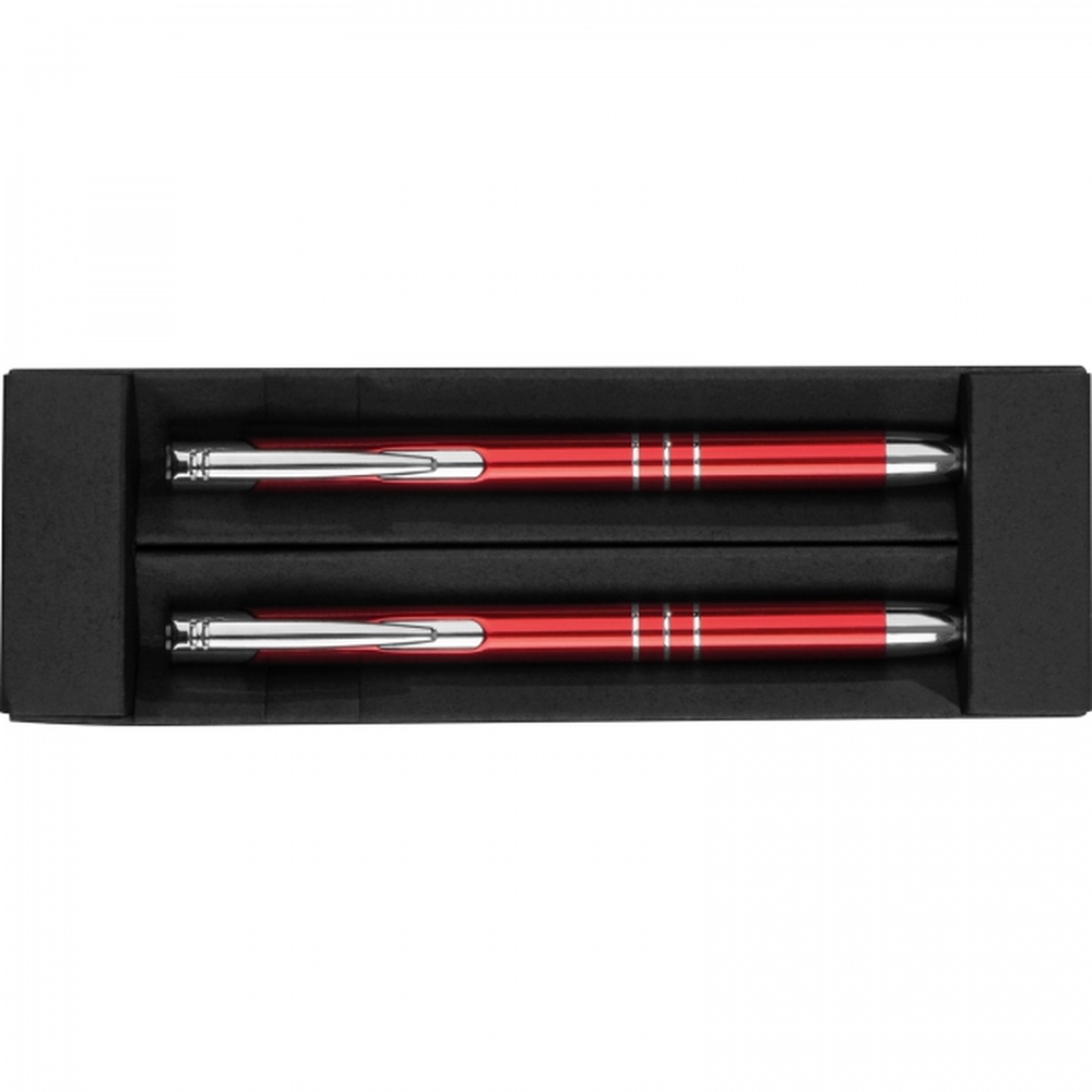 Metalowy zestaw piśmienny składający się z długopisu z niebieskim wkładem oraz ołówka automatycznego. Całość umieszczona w etui.