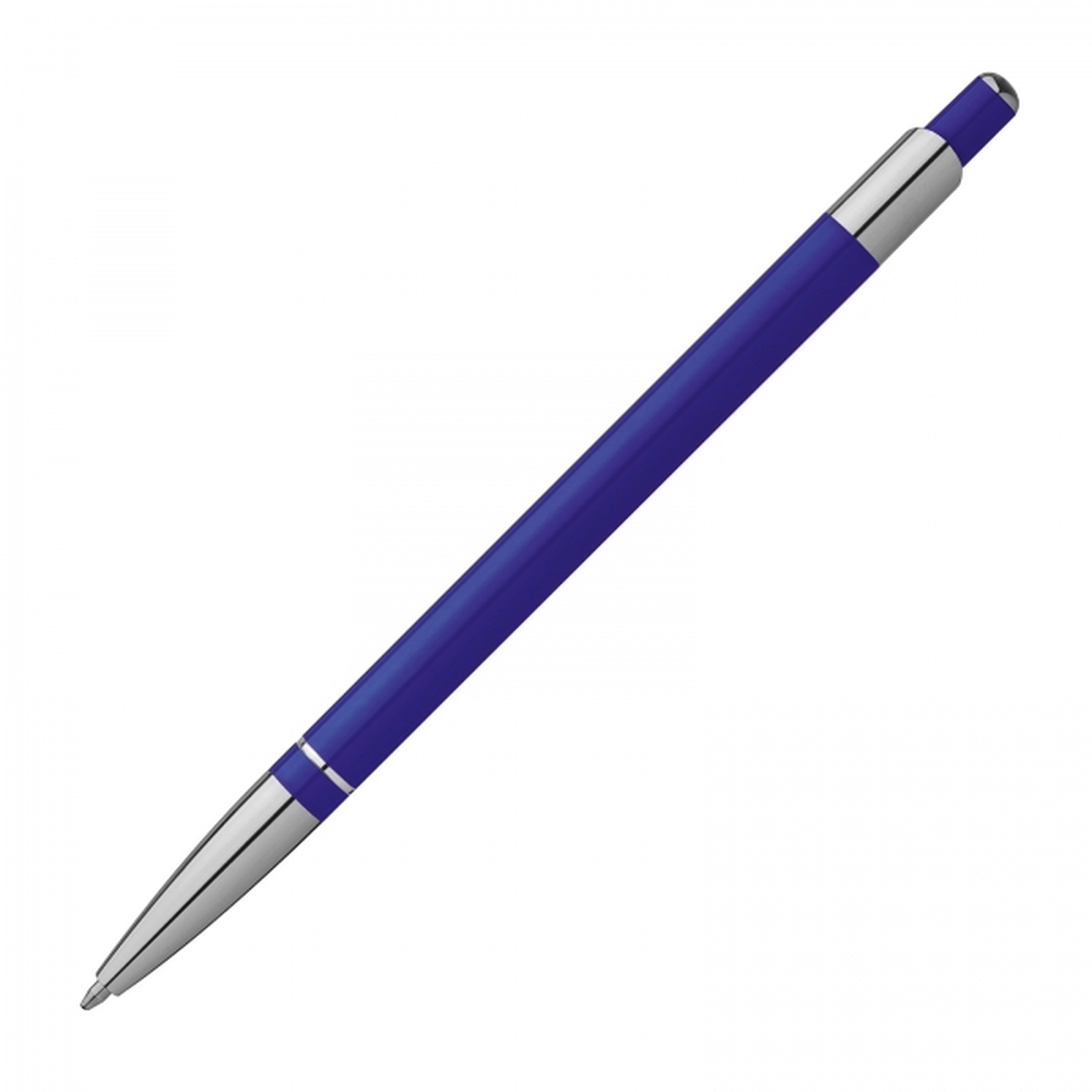 Długopis metalowy z wkładem piszącym na niebiesko.