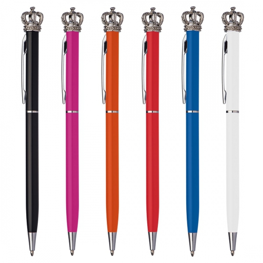 Metalowy długopis z mechanizmem obrotowym, zakończony koroną i kryształkiem Swarovskiego. Wkład pisze na niebiesko.