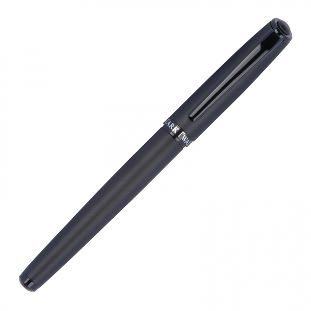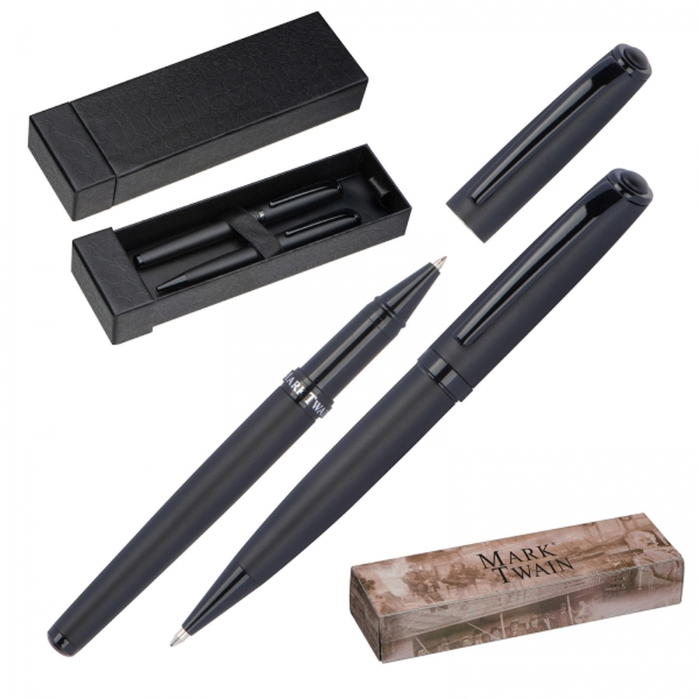 Zestaw piśmienniczy marki Mark Twain, składający się z długopisu z mechanizmem obrotowym z wkładem w kolorze niebieskim oraz pióra kulkowego piszącego na czarno. Oba przyrządy mają czarną, matową obudowę oraz błyszczące czarne wstawki. Pakowane w etui wyściełane satyną.