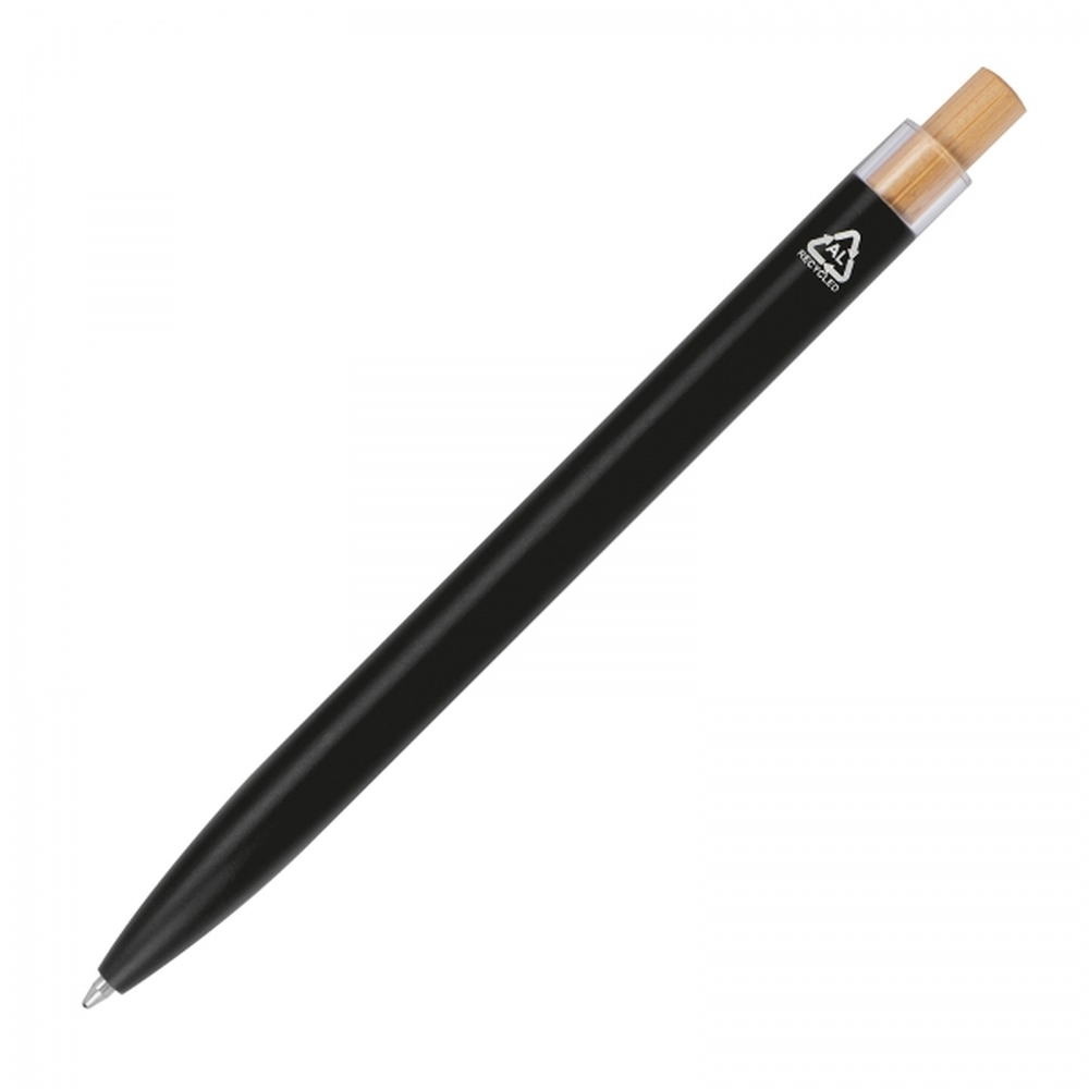 Długopis wykonany z aluminium pochodzącego z recyklingu, z niebieskim wkładem i bambusowym przyciskiem. Długopis wykonano z solidnego materiału, a dzięki odpowiedniemu ciężarowi, jest wyjątkowo wytrzymały i dobrze wyważony w dłoni. Powłoka długopisu gładka w dotyku, matowa.