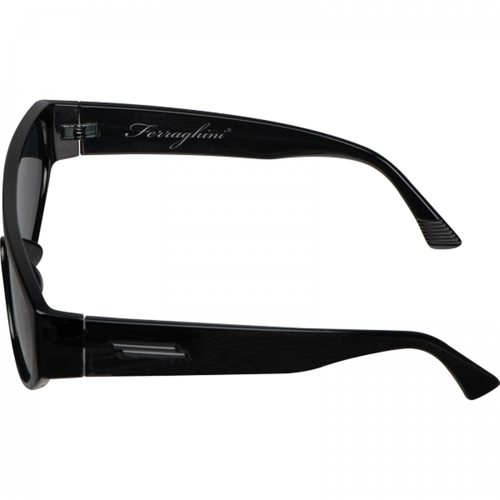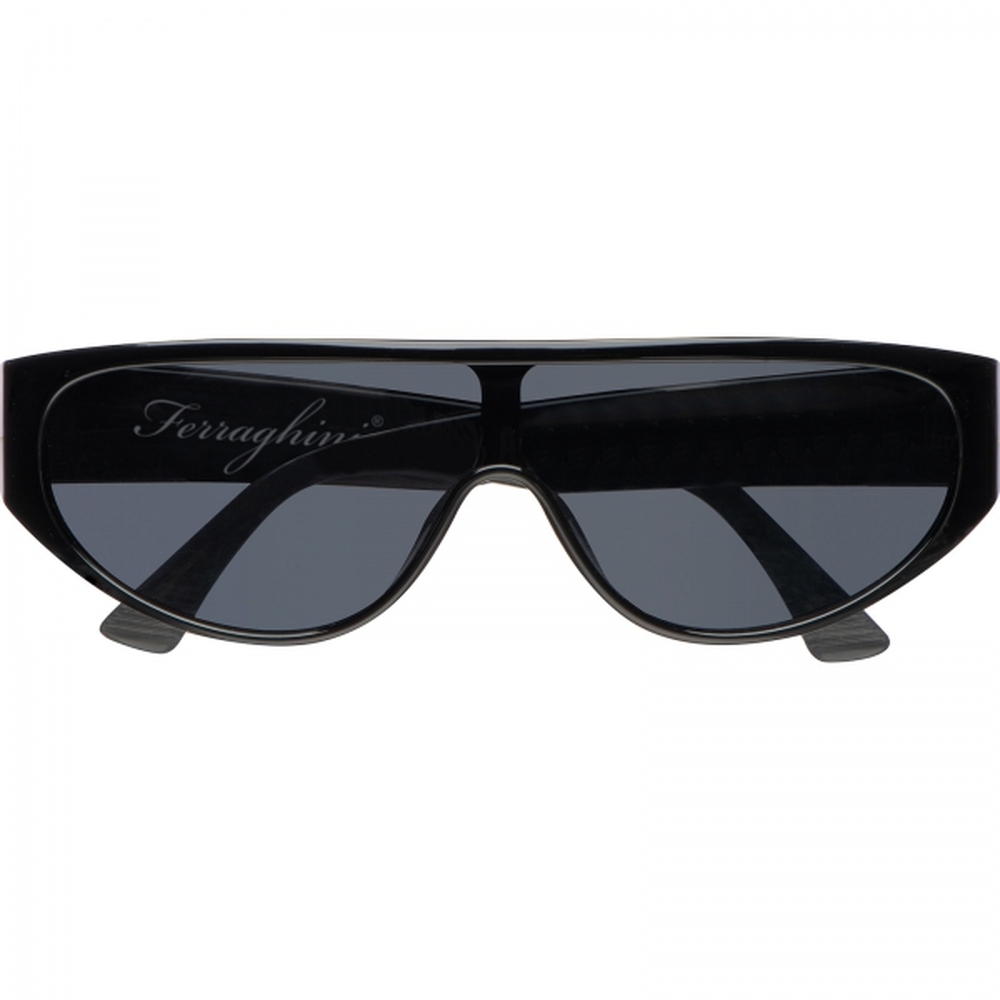 Okulary przeciwsłoneczne marki Ferraghini, z czarnymi szkłami, wykonane z RPET. Ochrona UV400, filtr 3 kategorii. Okulary zapakowane w wysokiej jakości etui.