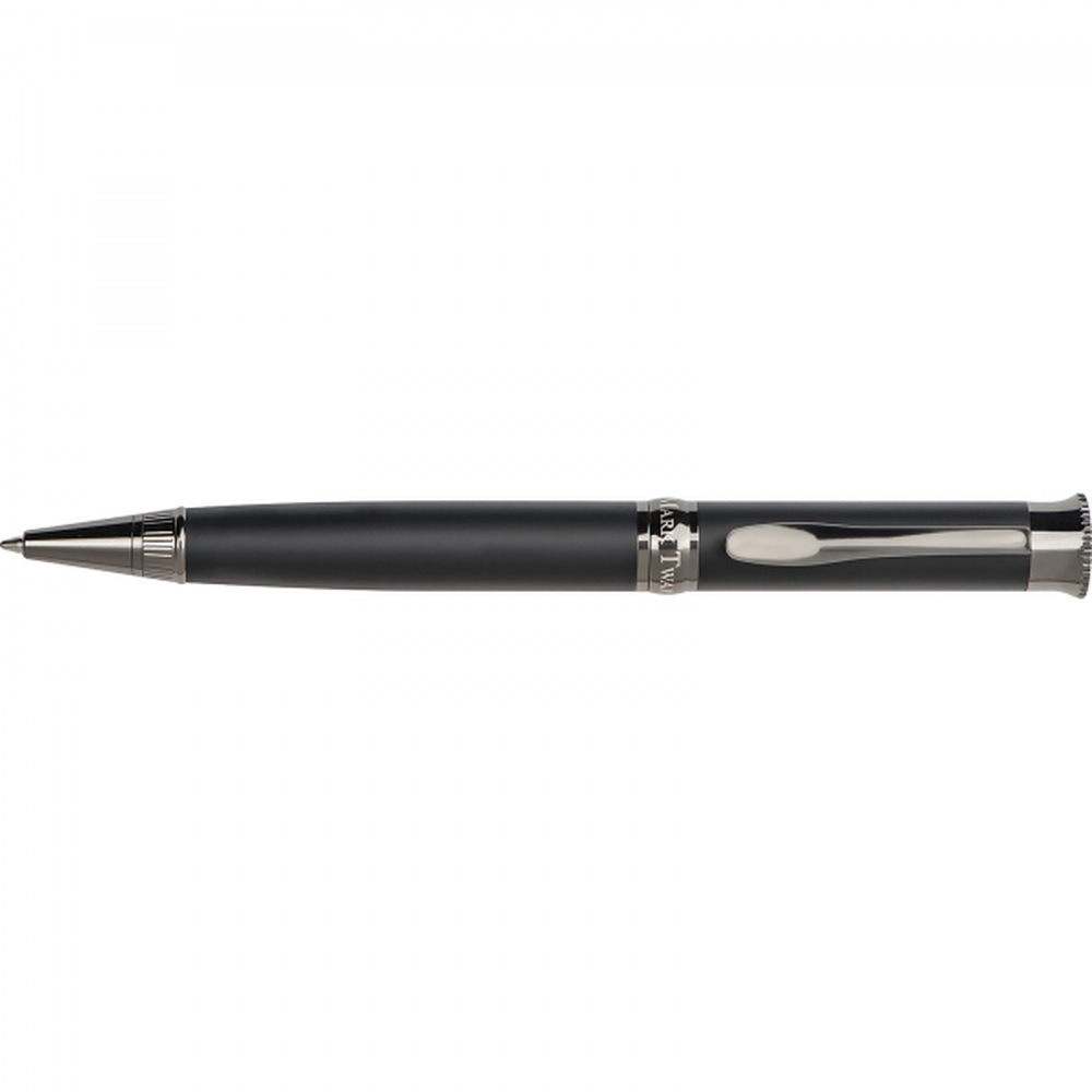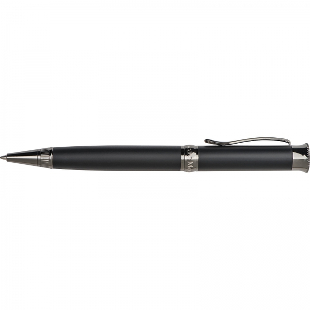 Metalowy długopis marki Mark Twain z chromowanymi elementami i dużym wkładem piszącym na niebiesko. Zapakowany w eleganckie etui.