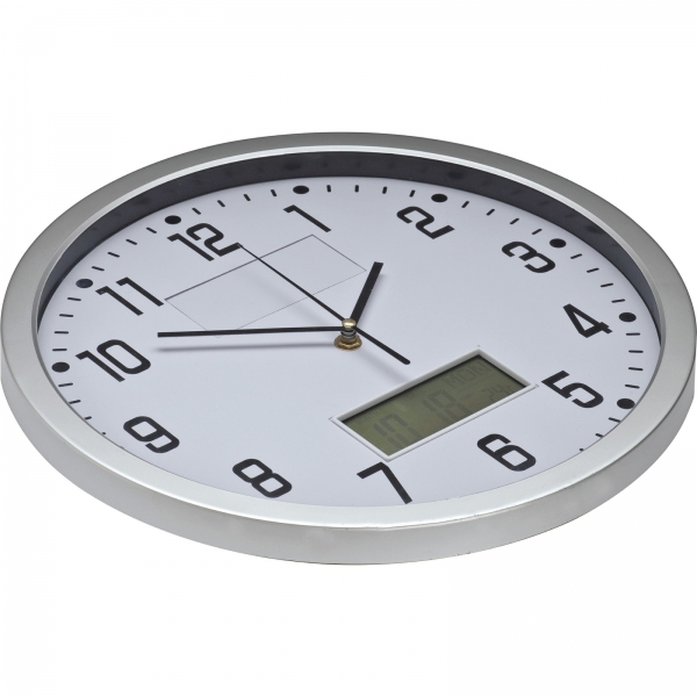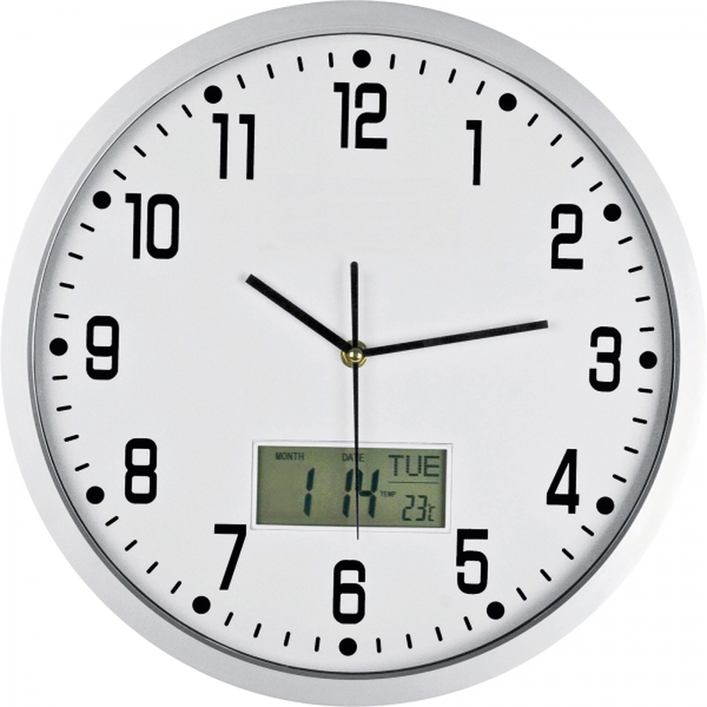Analogowy zegar ścienny CrisMa z dużym, cyfrowym wyświetlaczem, pokazującym datę, dzień tygodnia oraz temperaturę. Logotyp można umieścić na specjalnym panelu reklamowym, pod ochronną szybką zegara.