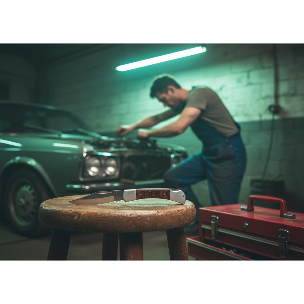 Składany nóż wykonany ze stali nierdzewnej, z drewnianą rękojeścią i blokadą bezpieczeństwa.