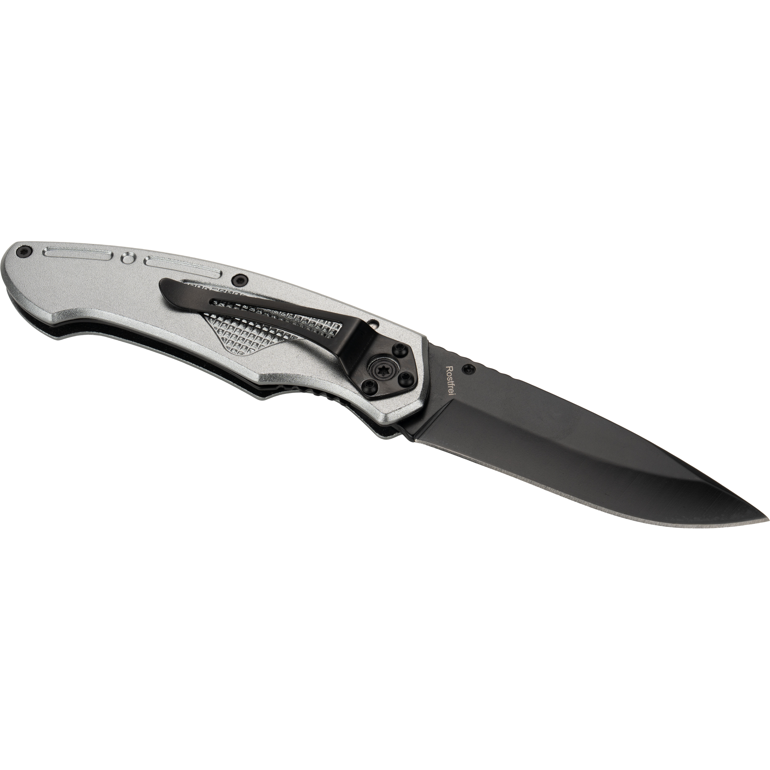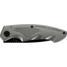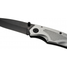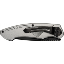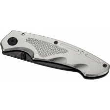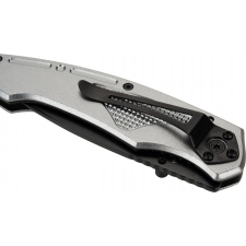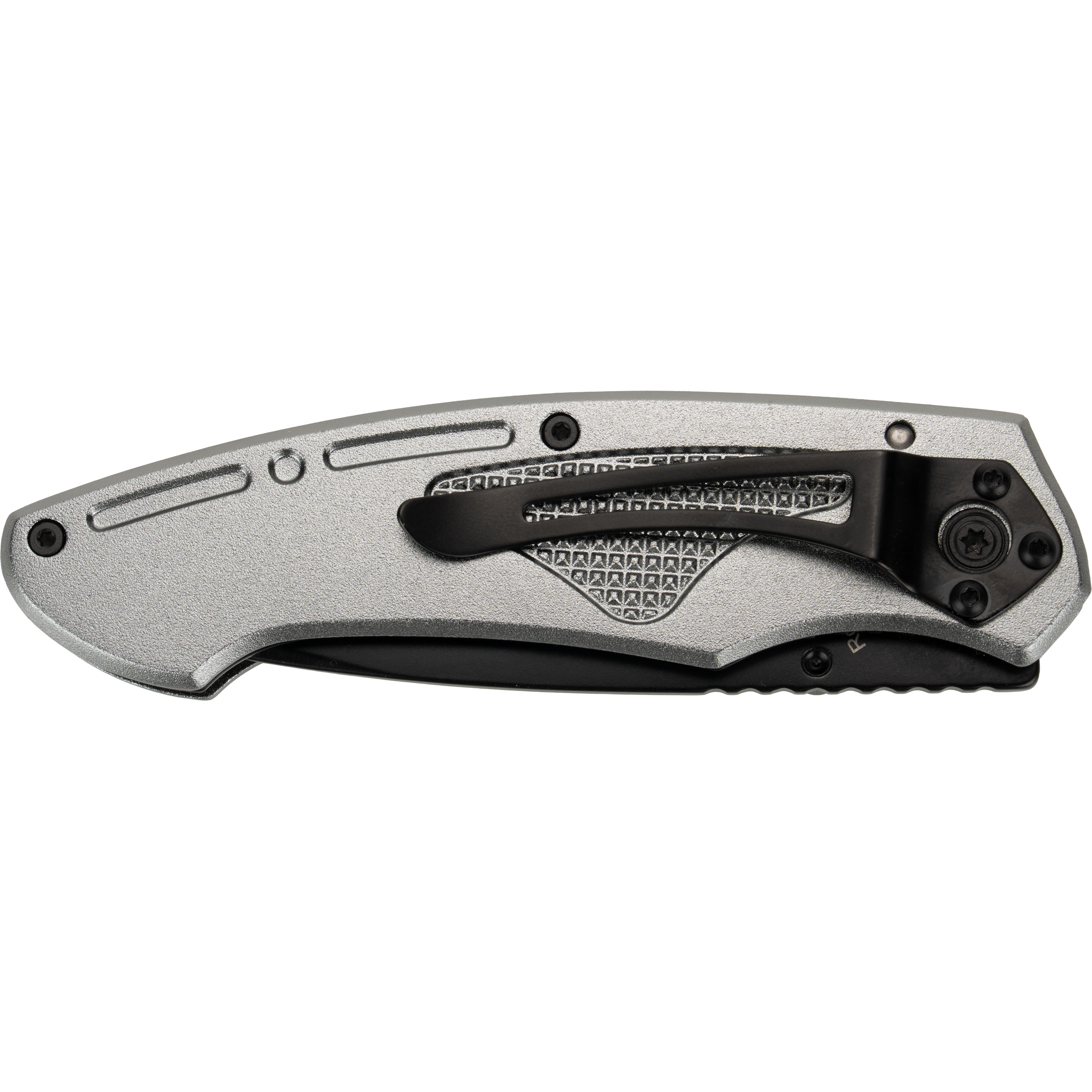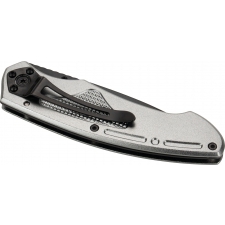 Nóż kieszonkowy wykonany ze stali nierdzewnej z aluminiową rękojeścią i klipsem do mocowania na pasku.