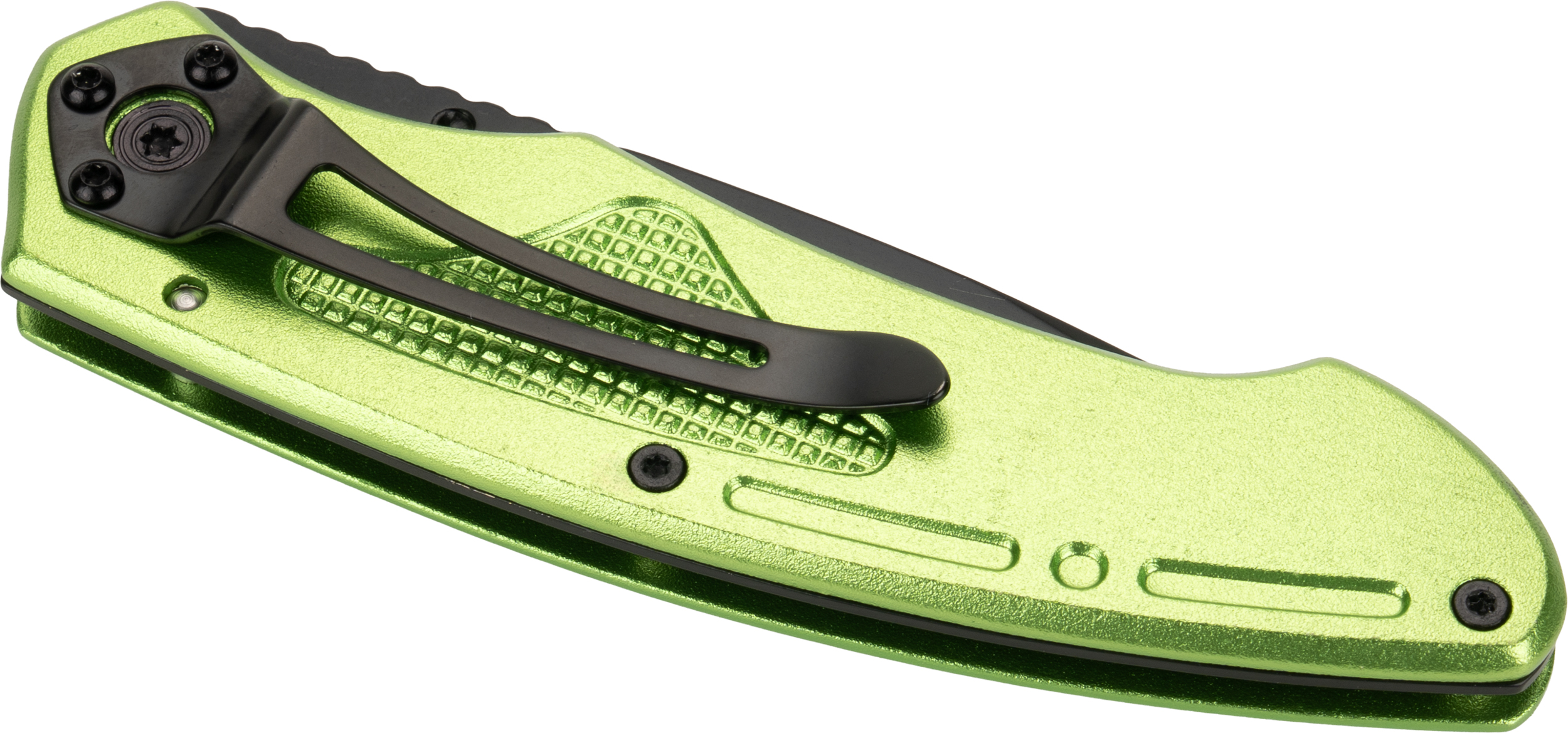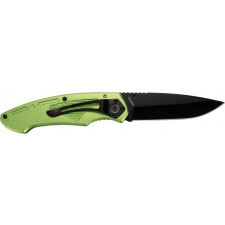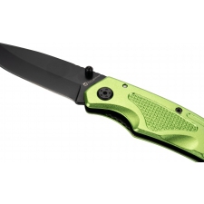Nóż kieszonkowy wykonany ze stali nierdzewnej z aluminiową rękojeścią i klipsem do mocowania na pasku.