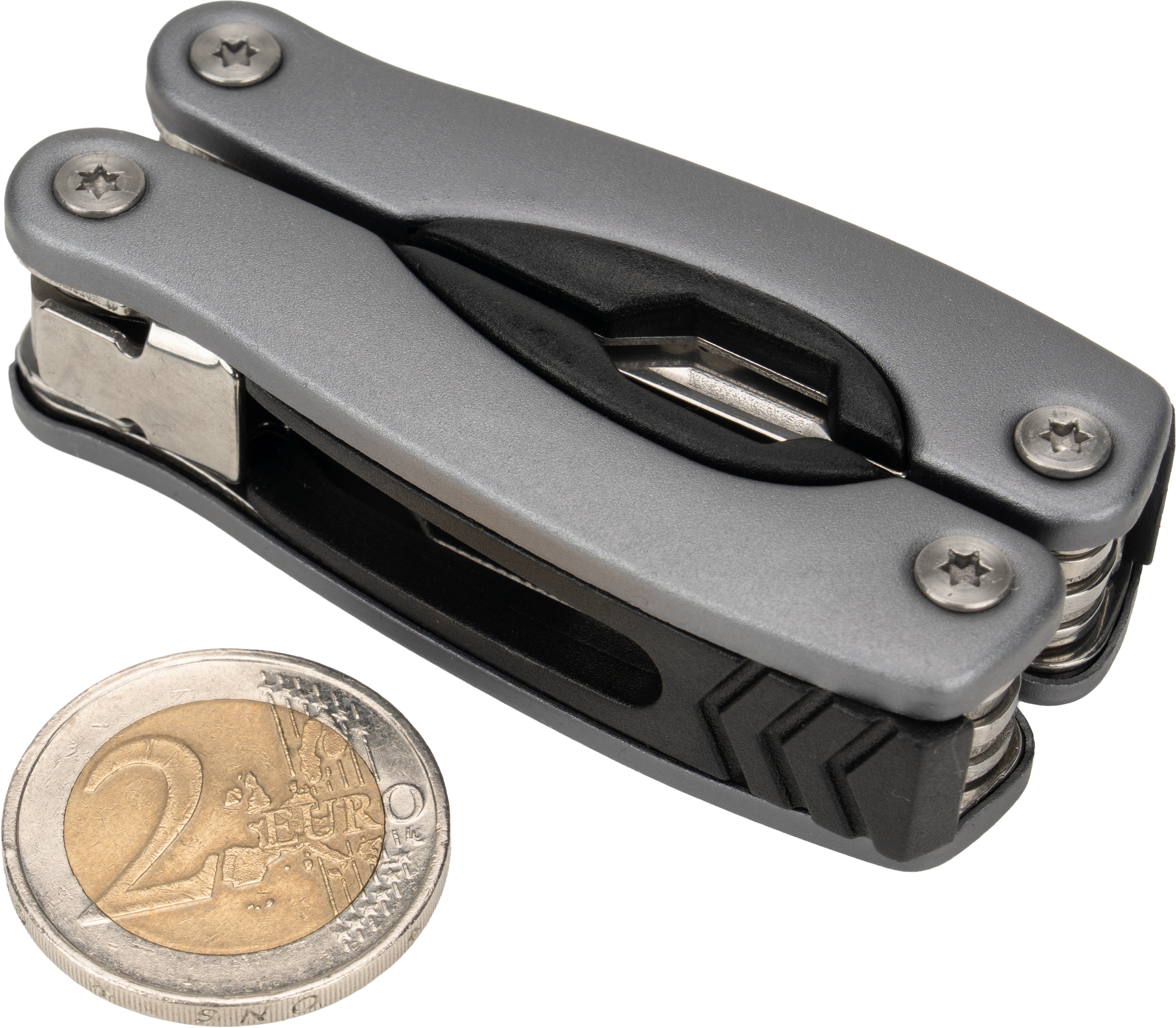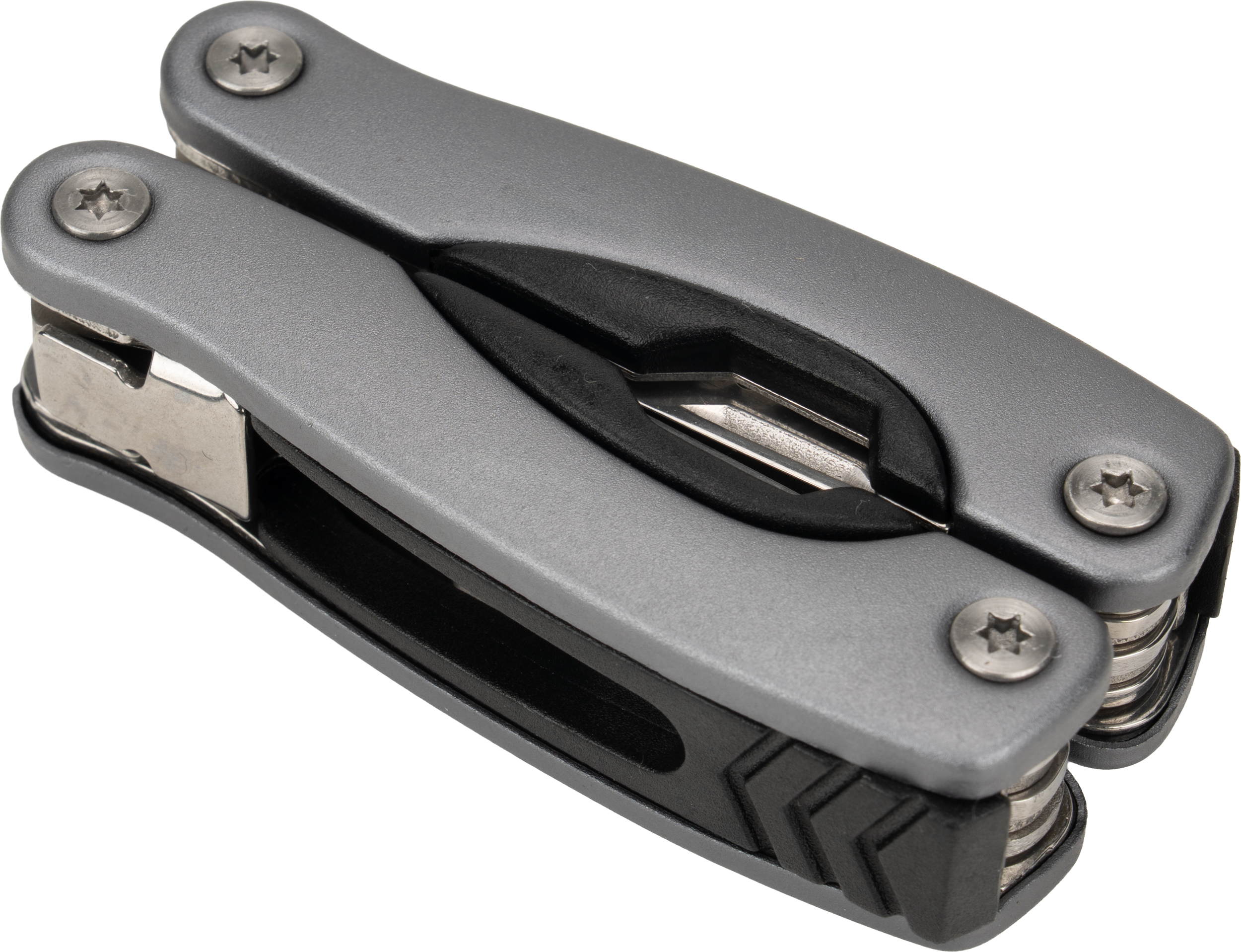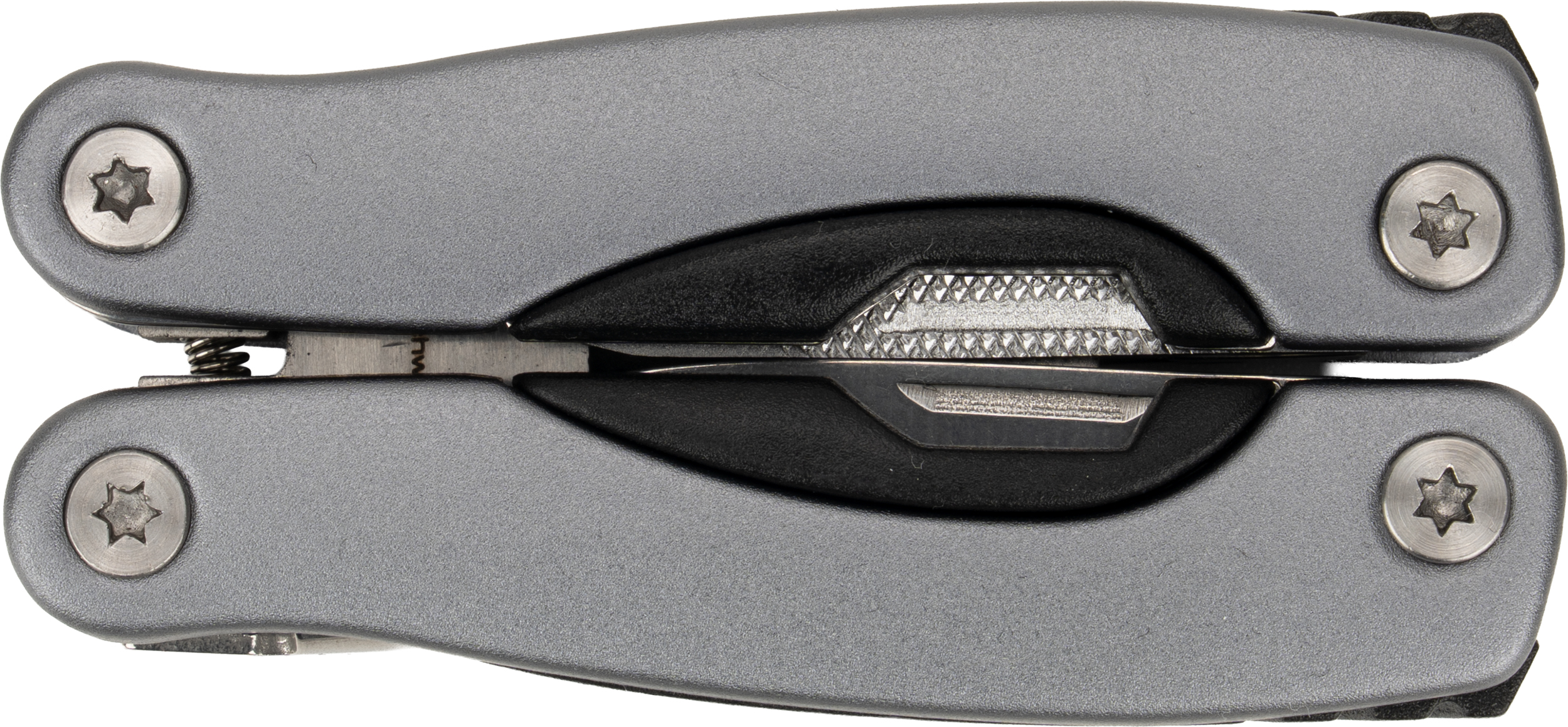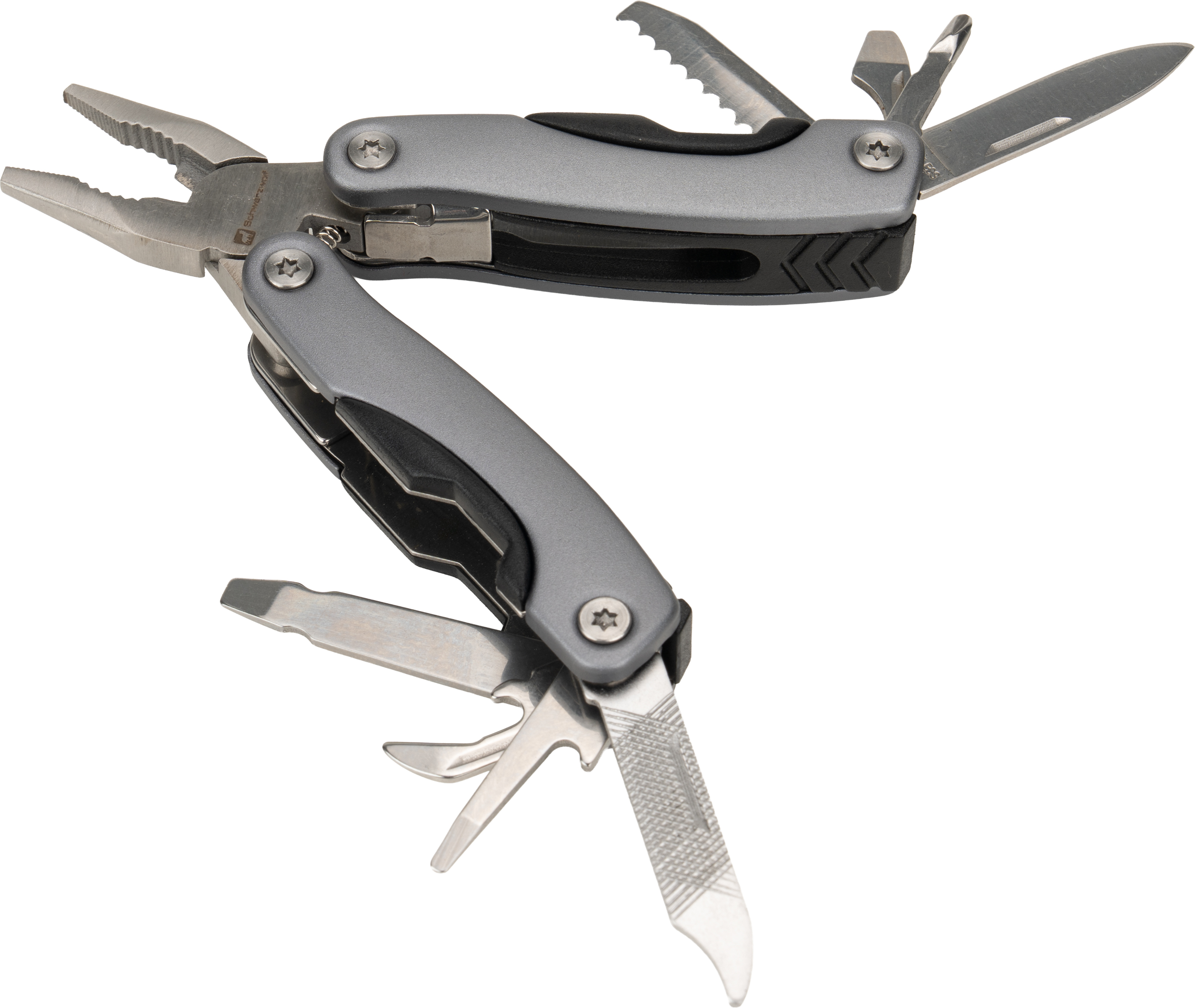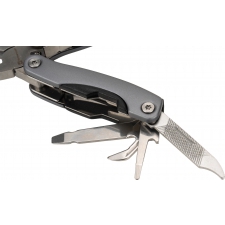 Multitool posiada 13 narzędzi, m.in.: kombinerki, pilnik, śrubokręt płaski i Philips, nóż, piłka, otwieracz do butelek i konserw. Narzędzie zapakowane w neoprenowy pokrowiec.